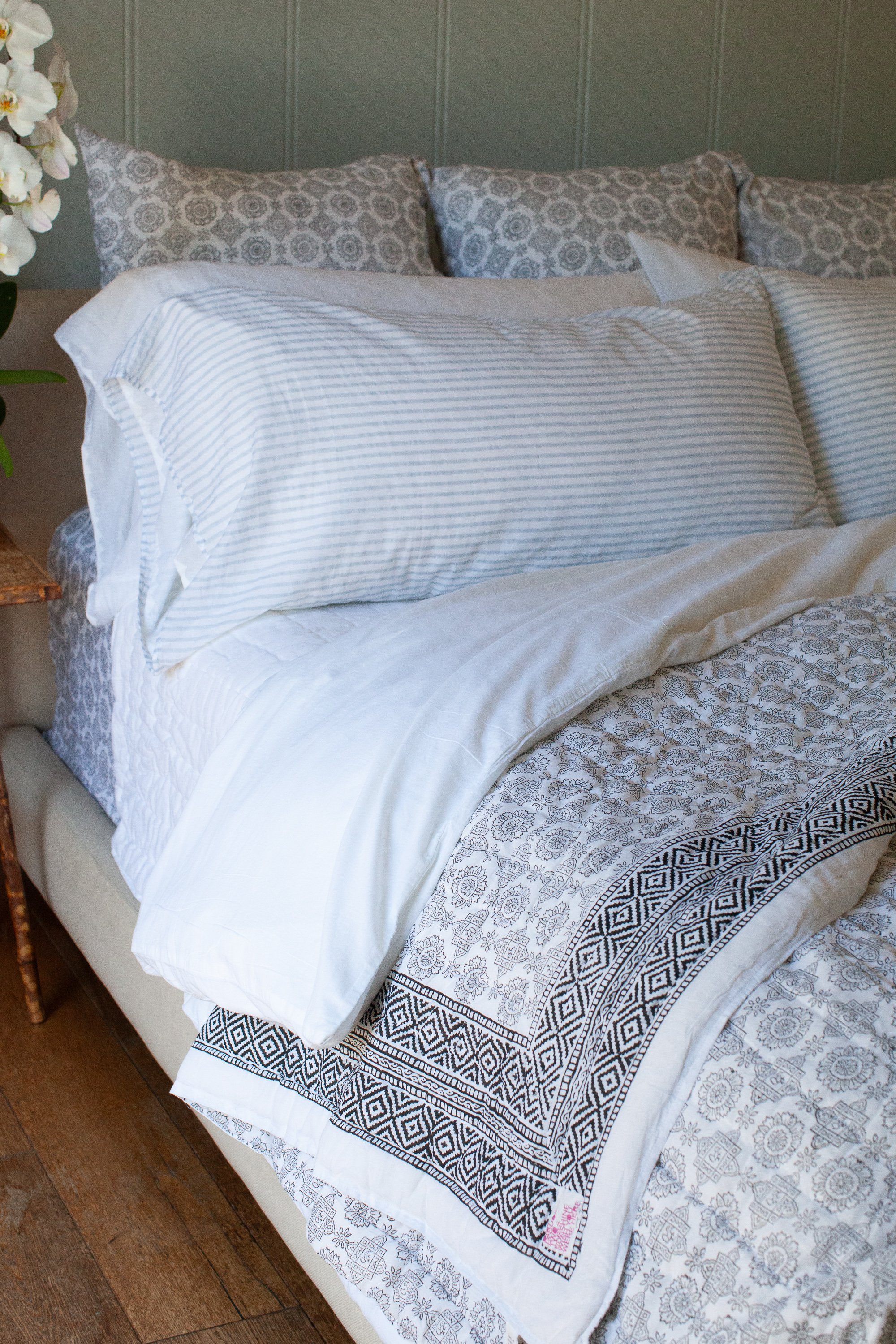 Kerry's Pillowcases offer the epitome of luxury with their highest-quality, soft Indian cotton. Each pillowcase is meticulously crafted with hand applique trim, adding a touch of sophistication and completing the distinctive Kerry Cassill aesthetic. With the ability to mix and match pillowcases from different seasons, customers have the flexibility to create their own unique combinations. Please note that all prices mentioned are for individual pillowcases, allowing customers the freedom to curate their bedding ensemble to suit their personal style and preferences.