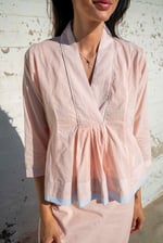 Machine embroidery detail at neckline with pleating on the bodice. 3/4 Sleeves with a chunky light blue hem.